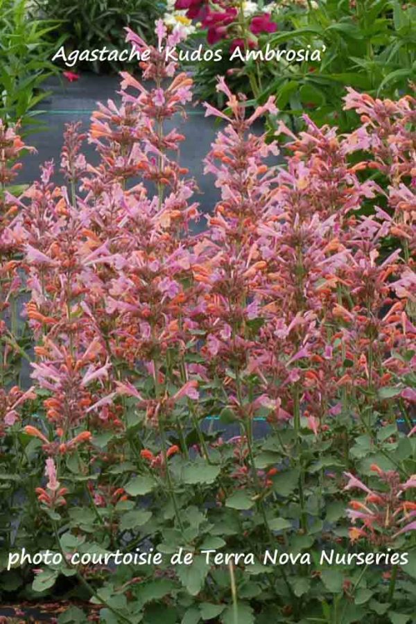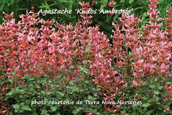 Introduction 2014. La firme Terra Nova Nurseries propose une série d’agastaches hybrides très performantes et rustiques (zone 5) nommée «Kudos». Le cultivar ‘Kudos Ambrosia’ a des fleurs rose foncé. C’est un plant compact qui mesure 40 à 45 cm de hauteur et 40 cm d’étalement. La floraison débute à la mi juillet et se prolonge jusqu’en septembre. La plante attire les papillons et les colibiris;  les chevreuils ne l’apprécient guère. Elle est très résistante au blanc (downy mildew).