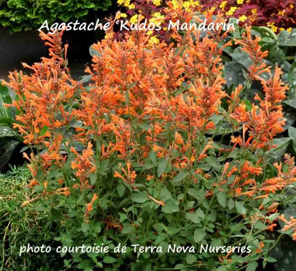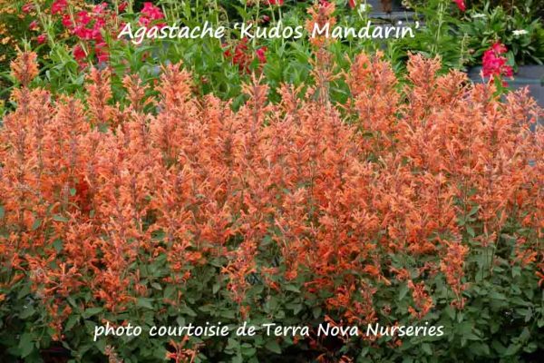 Introduction 2014. Le cultivar ‘Kudos Mandarin’ est une des quatre agastaches hybrides de la série «Kudos» proposées par la firme Terra Nova Nurseries. Les plants issus de cette série se caractérisent par des floraisons abondantes, des plants compacts et une grande résistance au blanc (downy mildew). Rustiques (zone 5), les plants mesurent de 40 à 45 cm de hauteur et d’étalent d’autant. le cultivar ‘Kudos Mandarin’ porte des épis de fleurs orange vif. La floraison début à la mi ou fin juillet et se prolonge, quelquefois, jusqu’en octobre. Les fleurs attirent les colibris, les papillons et les autres insectes butineurs. Le feuillage aromatique est généralement dédaigné par les chevreuils.