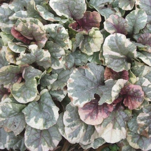 Le feuillage épais et arrondi est de coloration, rose, blanc et vert menthe avec bordure légèrement frangée. La nouvelle pousse est rouge vin et les épis de fleurs bleues sont courts. Couvre-sol compact et dense.