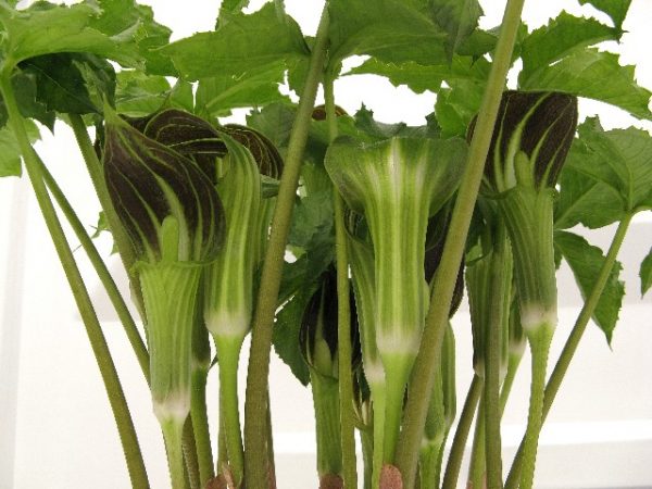 Belle plante rare pour l’ombre, voici le cousin asiatique de notre petit prêcheur nord-américain, l’Arisaema triphyllum. L’Arisaema amurense se distingue par ses 5 folioles, il est très rustique chez nous. Le cultiver dans un sol riche et légèrement humide. Cet Arisaema fleurit de la mi-Printemps à tôt en Été. La forme typique est verte et lignée de blanc, ou encore verte-brunâtre ou verte-mauvâtre, toujours avec des raillures blanches. Les fleurs se développent sur de petites tiges sous ou parmis les feuilles. Les feuilles sont composées de 5 petites feuilles, et il n’y a toujours qu’une seule feuille.