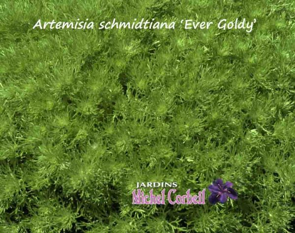 Introduction 2014. Originaire du Japon, l’Artemisia schmidtiana est une vivace rustique (zone 4), au feuillage décoratif, finement découpé formant une touffe argentée, basse et dense. Le cultivar ‘Ever Goldy’ (syn. ‘Gold Leaf’) présente une feuillage au coloris jaune verdâtre argenté, plus jaune au printemps. Le plant s’élève sur 15 à 25 cm et s’étale sur 30 à 50 cm. Cette armoise fleurit en juillet-août mais la floraison est peu décorative. Cette plante convient à une bordure de plate-bande ou une rocaille; elle tolère la sécheresse et son feuillage est ignoré des chevreuils, des lièvres et des marmottes. Elle pousse dans un sol meuble, pauvre à ordinaire, très bien drainé et sur un emplacement ensoleillé.