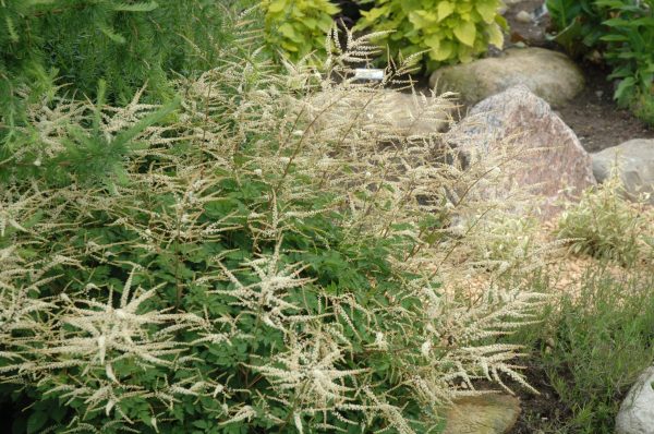 Barbe de bouc ayant la dimension parfaite car elle est issue d’un croisement entre A. aethusifolius et A. dioicus. Larges panicules de fleurs blanc crème portées sur des tiges pourpres. Peut supporter le plein soleil si le sol possède une bonne humidité. Résistant aux chevreuils.
