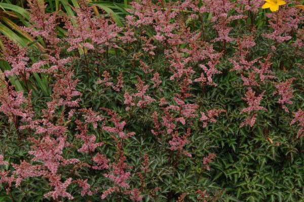 Astilbe provenant d’un semis de la célèbre ‘Sprite’. La floraison débute en mi-été avec des boutons rouges qui deviendront roses à maturité. Les tiges courtes, solides et rouges soutiennent un feuillage rougeâtre qui deviendra vert en saison.Une vivace prometteuse à découvrir…
