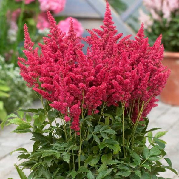 ASTILBE ‘Short’n Sweet Fireberry’ –Généralités – La classification botanique du genre Astilbe varie selon les auteurs et compterait entre 12 et 35 espèces différentes. Pour l’amateur, cette classification a peu d’importance car les nombreux cultivars offerts dans les pépinières ont remplacé avantageusement les diverses espèces botaniques. Parmi tous les cultivars offerts, un grand nombre sont regroupés sous le nom d’hybride arendisii. Les premiers d’entre eux ont été développés par Georg Arends au début du XXe siècle. Depuis les premiers croisements, de nombreux autres hybrideurs, ont développé et commercialisé une multitude de nouveaux cultivars; plus de 300 sont répertoriés. Il est de plus en plus difficile de définir le parentage de ceux-ci. Les astilbes sont très appréciés de la majorité des jardiniers pour leur facilité de culture, leurs magnifiques inflorescences et leur feuillage très découpé offrant un joli contraste avec les autres vivaces au feuilles arrondies-cordées des Hosta ou les feuilles lancéolées des Pulmonaria ou les feuilles étroites et rubanées de certaines graminées ornementales de milieu mi ombragé. L’inflorescence des astilbes est ramifiée et composée d’une multitude de fleurs minuscules. Selon les espèces et les cultivars, celle-ci présente des différences notables. Outre la couleur, blanc, rose pâle, lilas, rouge, etc., la panicule des astilbes peut être compacte et dense à lâche et retombante. On note également que les inflorescences se développent hâtivement ou tardivement selon les différents cultivars introduits. La classification – On classe les astilbes selon une multitude de caractéristiques ; les géniteurs (les parents), la hauteur, le type d’inflorescence, la couleur et la période de floraison (de hâtive à tardive). Cette dernière classification est intéressante car elle permet de sélectionner des cultivars qui fleuriront de la mi juin à la mi ou fin septembre. Culture – Les astilbes poussent sur un emplacement légèrement à mi ombragé. Elles ne sont pas des plantes d’ombre dense, où elles dépérissent lentement. Par contre, elles croissent bien au plein soleil dans la mesure où le sol meuble et riche en matière organique demeure frais ou légèrement humide tout au long de la saison de croissance. Par contre, elles redoutent beaucoup la compétition des racines des grands arbustes et des grands arbres car le feutre racinaire très efficace des espèces ligneuses soutirent l’eau disponible et les éléments nutritifs indispensables à leur croissance.