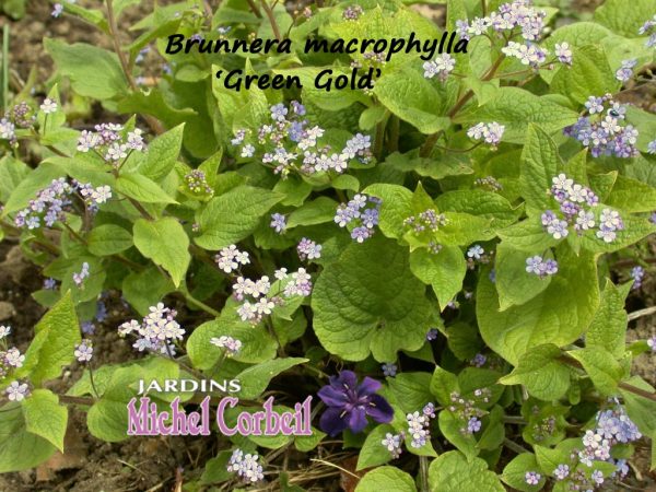 Introduction 2014 – Le cultivar ‘Green Gold’ est un myosotis du Caucase intéressant dont les jeunes feuilles cordiformes printanières ont un coloris jaune verdâtre à vert jaunâtre. La présence de cette vivace rustique (zone 3) apporte une touche lumineuse à une association de plantes au feuillage plus sombre. Dès le début de mai, de petites hampes florales portant des petites fleurs bleu lavande pâle, semblables à celles du myosotis, se développent au-dessus du feuillage. Le feuillage s’élève sur 25 à 35 cm de hauteur et le plant s’étale sur 40 à 45 cm. Le feuillage prend durant la période estivale une coloration vert légèrement jaunâtre. La plante pousse sur un emplacement légèrement à mi ombragé dans un sol meuble, ordinaire à riche, frais et bien drainé. Le feuillage est boudé par les chevreuils.