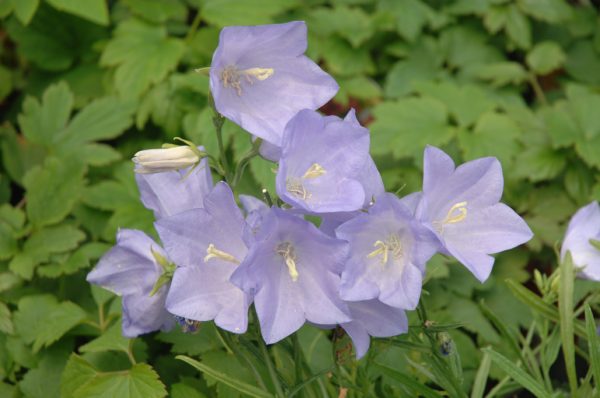 Introduction 2014. La série «Takion» se distingue des autres campanules à feuilles de pêcher disponibles par ses hampes florales plus compactes qui n'atteignent que 35 à 50 cm de hauteur. Chaque fleur est généralement plus grosse que les autres campanules, de l'ordre de 4 à 5 cm de diamètre. Les plants sont très florifères et la floraison se prolonge sur quelques semaines. Le cultivar 'Blue' porte des fleurs bleu violacé pâle, en forme de clochette, réunies sur un épis allongé. La plante pousse dans un sol plus moins riche, meuble, légèrement alcalin, bien drainé mais conservant durant la saison de croissance (surtout pendant la période de floraison) une certaine fraîcheur; elle demande une situation ensoleillée ou légèrement ombragée.