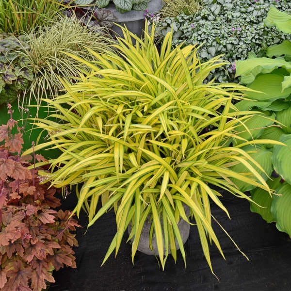 À première vue, vous pourriez prendre cette plante pour un hosta, mais c’est en fait une forme à larges feuilles de carex à feuilles caduques. Les feuilles d’un pouce de large sont citron vif ou jaune banane avec des marges étroites, vertes et des rayures. C’est une plante exceptionnelle pour égayer jardins ombragés et elle est également frappante dans des conteneurs. Elle est originaire des forêts de montagne, alors elle se sens chez elle en milieu ombragé. Il s’agit d’une plante de longue durée de vie.