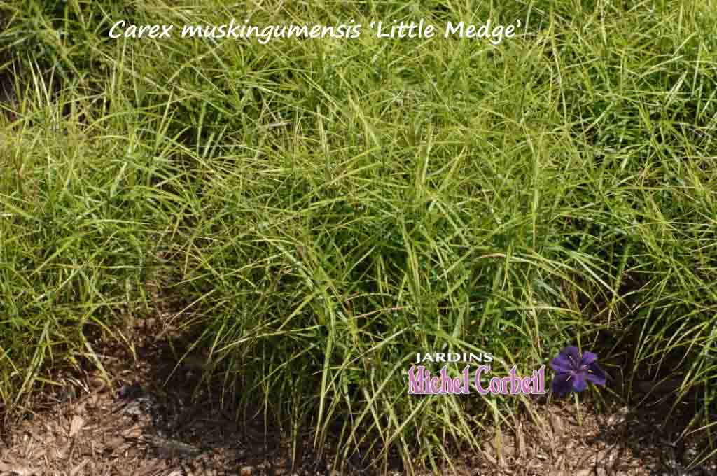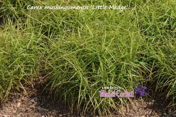 La laîche à feuilles de palmier (Carex muskingumensis) est une plante associée au groupe des graminées ornementales bien que le genre appartient à la famille des Cypéracées. L’espèce botanique est rustique (zone 4) et présente un port buissonnant, dont le port général ressemble à un palmier miniature; la plante s’élève sur 40 à 60 cm de hauteur et s’étale sur 40 à 50 cm. Le feuillage est semi-persistant. Le cultivar ‘Little Medge’ offre un port nettement plus compact et n’atteint guère plus de 25 cm de hauteur et s’étale sur 30 à 35 cm. La plante résiste à l’appétit des chevreuils. Cette laîche pousse dans un sol meuble, ordinaire à riche, frais à légèrement humide et sur un emplacement ensoleillé à légèrement ombragé. Elle a sa place près d’un bassin d’eau.