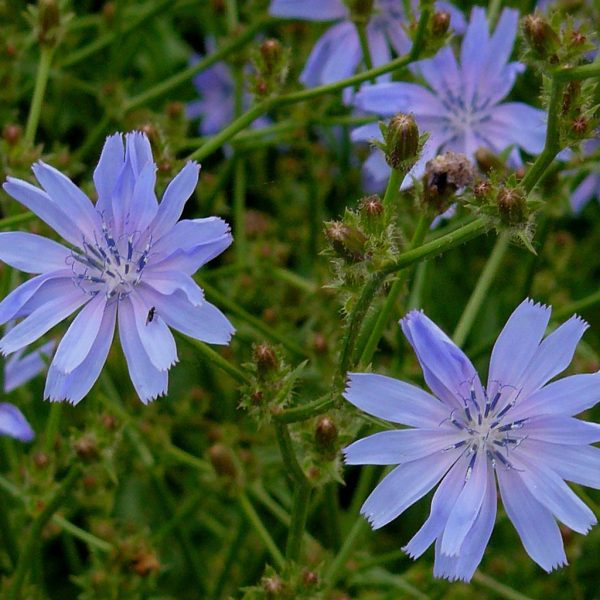 C’est bien elle, la chicorée sauvage qui agrémente les lieux incultes, comme les bords de route et les champs en friche, de ses fleurs bleu ciel durant les belles journées d’été. Voilà l’occasion d’introduire ce brin de beauté sauvage dans votre cour. Aucun danger d’invasion, elle est bien élevée! Fait à noter, ses racines torréfiées donnent un succédané de café. En fleur tout l’été.