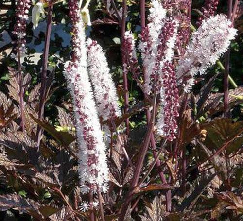 Un des plus sombres Cierges d’argent actuellement sur le marché. Feuillage caduc, découpé, poupre très foncé. Très florifère. Long épis parfumés, compacts.