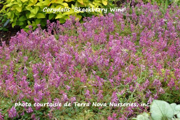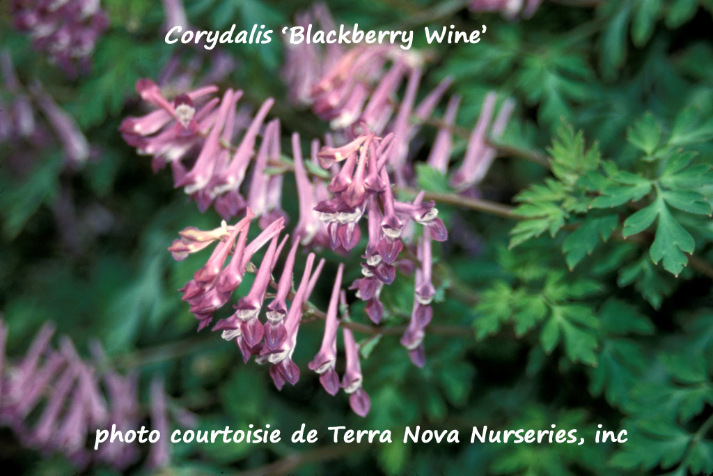 Introduction 2014 – Le Corydalis shihmienensis ‘Blackberry Wine’ est une jolie petite vivace qui nous offre un feuillage très découpé d’une texture légère que certains amateurs apprécient. Cette corydale ou fausse fumeterre est une plante à fleurs dont les feuilles très découpées s’élèvent sur 15 à 20 et le plant s’étale sur 35 à 40 cm. Les fleurs groupées en épis se développent tôt au printemps, au-dessus du feuillage. Le feuillage et les épis de fleurs font 20 à 25 cm de hauteur rarement plus. Cette vivace rustique (zone 5) est conseillé aux jardiniers avertis car sa culture est délicate et on considère cette plante comme peu longévive. Elle croît en situation légèrement à mi ombragée dans un sol meuble, riche en matière organique, toujours frais et bien drainé. Notons que plusieurs espèces du genre Corydalis sont maintenant identifiées au genre Pseudofumaria.