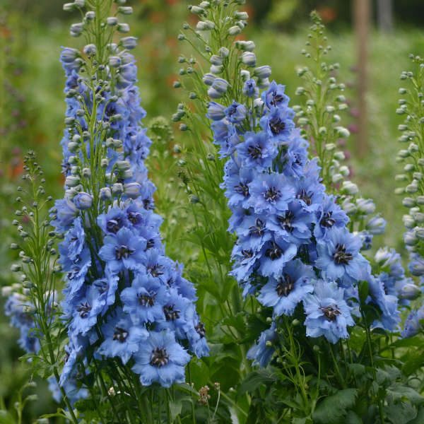 Voici un des plus compacts pied d'alouette provenant de la série New Millenium Hybrids (Nouvelle-Zélande). Fleurs généreusement colorées de bleu ciel légèrement teintées de rose et ornées d'un oeil variant du brun au noir. Ses tiges larges et robustes ajoutent de la structure au jardin. Feuillage vert, plus pâle que les autres membres de la série New Millenium Hybrids. Tailler la tige florale principale dès que sa floraison est terminée. Ceci favorisera l'émmergence de nombreuses pousses secondaires et prolongera par le fait même la période de floraison. Un site ensoleillé est à prévilégier afin d'obtenir des plants plus solides et exempts de maladie (diminue les risque de l'apparition du mildiou). Plante gourmande de compost. Peut nécessité un tuteurage.