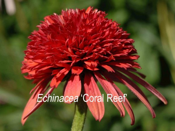 Le cultivar ‘Coral Reef’ est une introduction de la firme Terra Nova Nurseries, inc. Sa rusticité en zone 5 est bien établie car elle passe l’hiver avec succès dans les jardins du sud-ouest du Québec. Les tiges feuillées s’élèvent sur 0,80 à 1,10 m de hauteur; le plant s’étale sur 60 cm. Les capitules de type «fleur d’anémone» portent des fleurs tubulaires transformées en pièces pétaloïdes corail orangé foncé formant un dôme bombé et des rayons d’un corail orangé plus pâle. Les inflorescences s’épanouissent au début de juillet et se renouvellent jusqu’à la fin août.