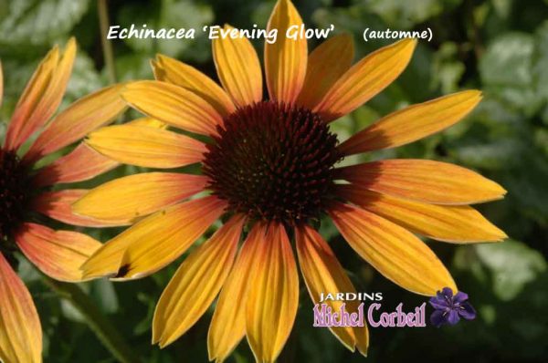 Comme les couleurs changeantes d’un coucher de soleil, le cultivar ‘Evening Glow’ présente des capitules aux rayons de couleurs chaudes; mais les coloris changent avec la température. Les inflorescences offrent des ligules colorés rose pâle, rose pêche et pêche jaunâtre durant la majeure partie de la période estivale et un centre brun invariable. Quand les températures s’abaissent et qu’il fait plus froid, les capitules présentent des rayons plus jaune vif à la base rouge comme sur les photos de promotion de ce cultivar. Nous cultivons cette échinacée depuis 2011 dans nos jardins de démonstration sis sur le terrain de notre entreprise à Saint-Eustache (zone 5) et nous apprécions sa floribondité et le coloris de ses nombreux capitules. Nous n’hésitons pas à la conseiller à nos clients, vous ne serez pas déçus. Le plant s’élève sur 60 à 80 cm et s’étale sur 50 cm. La floraison débute en juillet et les inflorescences se renouvellent jusqu’à la fin se septembre.