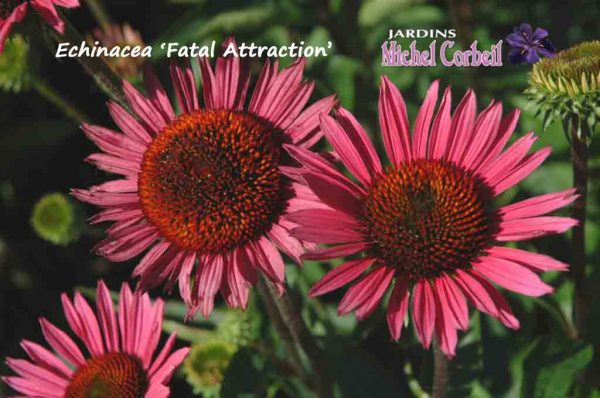 Le cultivar ‘Fatal Attraction’ est salué par de très nombreux jardiniers qui le cultivent, semble-t-il, sans problème. Les essais effectués par l’horticulteur Daniel Fortin, en zone 5, dans des conditions optimales de culture mais sans protection hivernale particulière, ne suscitent pas autant d’enthousiasme. Deux années consécutives, les plants introduits ont souffert et les pertes furent nombreuses. Pour ces raison, nous conseillons ce très beau cultivar là où le sol est parfaitement drainé et où la couverture de neige est abondante et présente de façon continue. Les tiges feuillées, vert noirâtre, s’élèvent sur 55 à 70 cm et le plant s’étale sur 40 cm. Les capitules, aux rayons horizontaux plutôt courts, sont d’un rose très foncé (rose fuchsia); le large centre (fleurs tubulaires) est brun orangé; la «fleur» est particulièrement jolie. Les inflorescences s’épanouissent en juillet et se renouvellent jusqu’à la fin d’août; les fleurs sont parfumées. C’est une grande séductrice… qui demande une attention particulière.