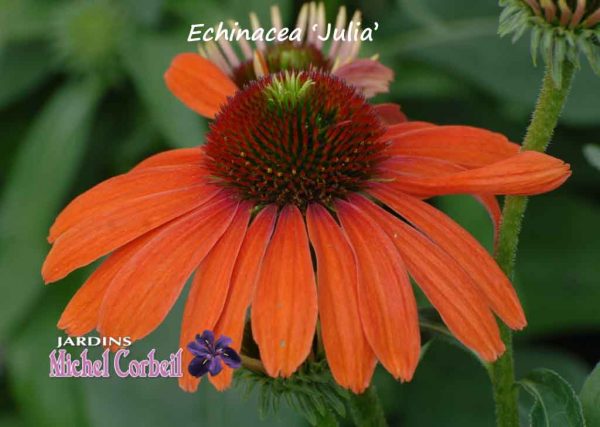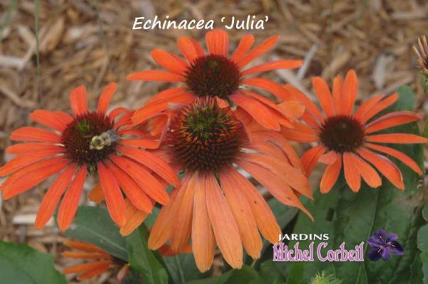 Le cultivar ‘Julia’ est une obtention de l’hybrideur hollandais Arie Blom. C’est un plant compact, aux tiges feuillées de 40 à 50 cm de hauteur, portant des capitules, de 10 cm de diamètre, aux ligules orange; cette échinacée conserve bien la coloration de ces «fleurs». La floraison est prolongée; les inflorescences se développent au début de juillet et se renouvellent jusqu’au début de septembre. Cette échinacée est parfaite pour la devanture d’un massif où elle illuminera un coin de votre jardin ou la culture en contenants ou en pots.  Le cultivar «Cleopatra», du même hybrideur, est  une sélection jaune vif de hauteur comparable (également disponible).