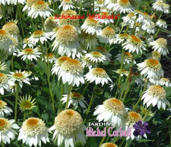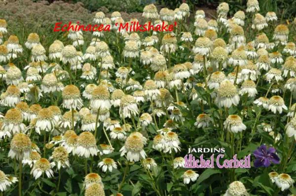 La série «Con-fections» accueille de magnifiques cultivars développés par Arie Blom; nous pouvons citer parmi ceux-ci ‘Hot Papaya’, ‘Marmalade’ et ‘Milkshahe’. L’horticulteur Daniel Fortin qui a mis à l’essai plus d’une centaine de cultivars d’échinacées depuis 2008 considère le ‘Milkshake’ comme un hybride de premier choix avec ses capitules de type «fleur d’anémone», aux fleurs tubulaires (centre) transformées en pièces pétaloïdes d’un couleur blanc cassé de jaune entourées de rayons blanc pur. Le plant s’élève sur 60 à 80 cm et s’étale sur 60 à 70 cm. Les inflorescences s’épanouissent en juillet et se renouvellent jusqu’à la fin août. C’est un plant plus haut et plus ramifié que le cultivar ‘Coconut Lime’.