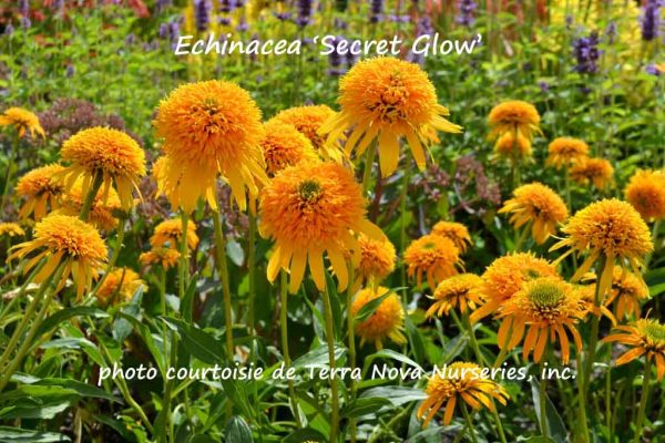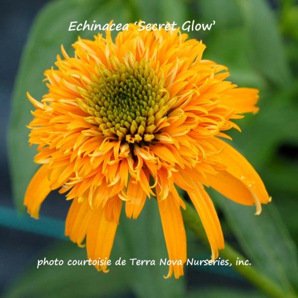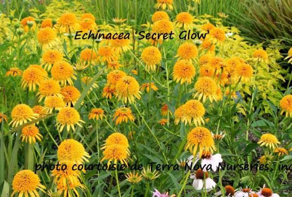 Introduction 2014. Le cultivar ‘Secret Love’ est un autre hybride de la série «Secret» offerte et développée par la firme Terra Nova Nurseries. On appelle ce cultivar, affectueusement, «l’autobus scolaire» car ses capitules de type «pompon» ou «fleur d’anémone» porte des pièces pétaloïdes et des ligules (rayons) d’un jaune orangé très lumineux. Un coloris assez unique dans le vaste groupe des échinacées. Cet hybride mérite un sobriquet plus respectueux tant ses «fleurs» sont de précieuses alliées dans nos associations de vivaces. Les tiges feuillées portant les inflorescences s’élèvent sur 65 à 70 cm et le plant s’étale sur 50 à 60 cm. On compterait régulièrement 35 capitules par plant; c’est dire son abondante floraison. Celle-ci débute en juillet et se prolonge jusqu’à la fin d’août ou le début de septembre. Nous ne connaissons pas encore sa limite septentrionale de rusticité; elle pousse bien en zone 5.