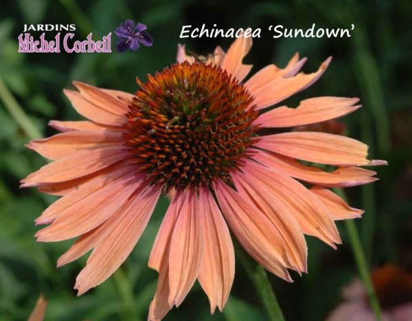 Le cultivar ‘Sundown’ (syn. ‘Eva Saul’) est une obtention de l’hybrideur Richard Saul de la firme ItSaul Plants of Georgia. Les essais effectués par l’horticulteur Daniel Fortin durant les dernières années confirment la floribondité et la rusticité de cet hybride pour le sud-ouest du Québec (zone 5). Aucun plant n’a été perdu dans les plates-bandes sous sa supervision. Cette autre échinacée de la série «Big Sky» est souvent comparé au cultivar ‘Sunset’, toutefois le ‘Sundown’ est un plant plus haut et la coloration des rayons est un peu plus intense; ce sont deux excellents hybrides.  Les tiges feuillées de 80 à 90 cm de hauteur (le plant s’étale sur 50 à 55 cm) porte des capitules aux ligules (rayons) d’un rose corail pâle vieillissant sur un orange teinté de rose très pâle et un coeur (fleurs tubulaires) brun orangé. La floraison débute à la mi juillet et se prolonge jusqu’à la fin août ou le début de septembre.