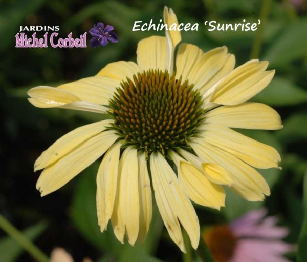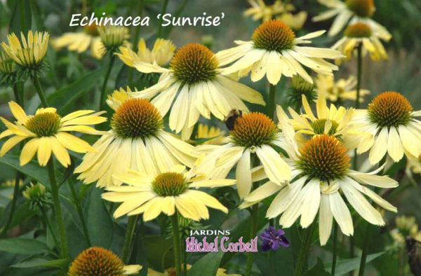 Le cultivar ‘Sunrise’, de la série «Big Sky» est une obtention de la firme ILSaul Plants of Georgia, dont l’hybrideur en chef est Richard Saul. C’est un hybride des plus intéressants, recommandé par l’horticulteur Daniel Fortin, qui a mis à l’essai plus de 120 taxons (espèces, variétés et cultivars) différents depuis 2008. Le plant, aux tiges feuillées de 0,75 à 1,00 de hauteur, s’étale sur 45 à 50 cm. Les capitules au centre brun orangé (fleurs tubulaires) sont entourés de ligules (rayons) d’un jaune pâle vieillissant vers un coloris crème jaunâtre. Ce cultivar est issu d’un croisement entre Echinacea purpurea ‘White Swan’ et (E. purpurea E. paradoxa). Les papillons visitent les «fleurs». La couleur des capitules s’associe bien à des vivaces à fleurs bleu véritable ou à bleu légèrement violacé.