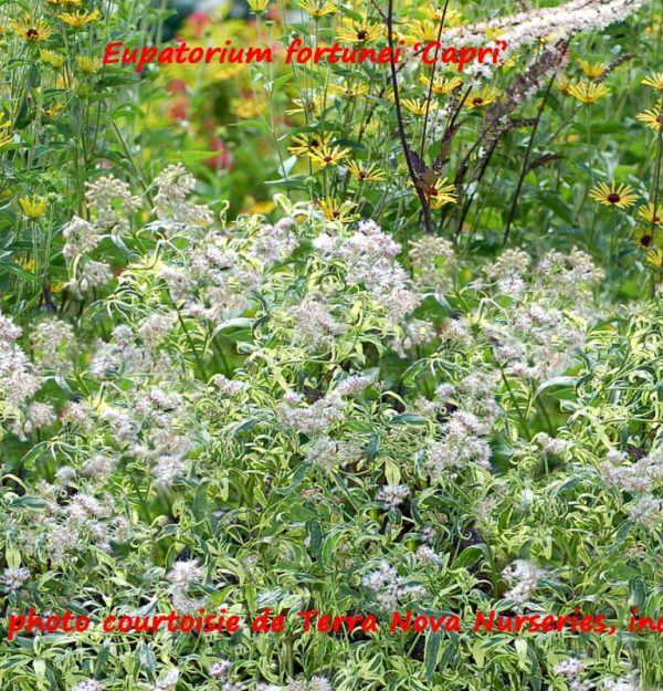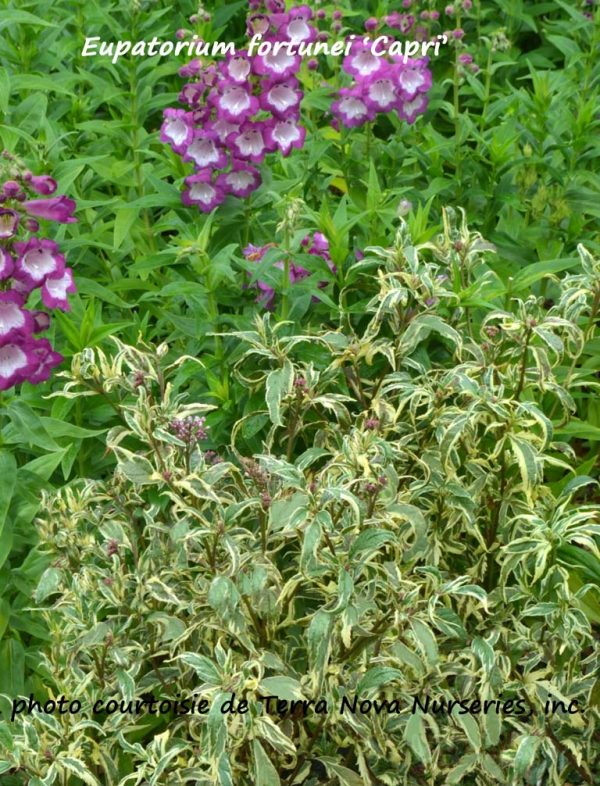 Introduction 2014 – Cette espèce est méconnue des jardiniers et pourtant rustique dans le sud-ouest du Québec (zone 4). Le cultivar ‘Capri’ est intéressant pour son feuillage superbement coloré de vert, de rose et de jaune crème. Le plant est plutôt compact pour une eupatoire ne s’érigeant que sur 60 à 70 cm de hauteur et s’étalant sur 50 à 60 cm. Des corymbes des petits capitules arrondis d’une rose pâle se développent au sommet des tiges feuillées. La floraison débute à la mi août et se prolonge jusqu’à la fin de septembre. Les fleurs attirent les papillons; le feuillage est boudé par les chevreuils. Cette eupatoire croît en situation ensoleillée ou légèrement ombragée dans une terre ordinaire à riche, meuble, plutôt fraîche mais bien drainée.