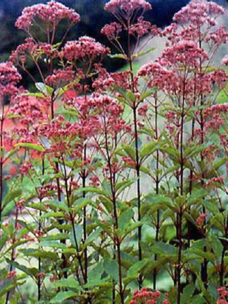 EUPATORIUM ‘Purpureum’: Vigoureuse, érigée, c’est une plante à isoler ou pour faire un fond de massif à elle toute seule. Elle attire les papillons pendant tout l’été de ses grosses fleurs roses, parfois blanches. Elle est très gourmande en eau et en soleil.