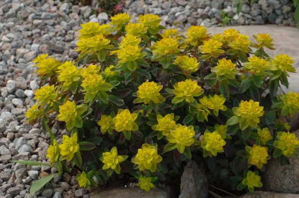 Le choix des experts JMC 2014 (catégorie « les performantes »). L’euphorbe polychrome (syn. E. epithymoides) est une plante intéressante à plus d’un titre. Comme la majorité des Euphorbiacées, ce ne sont pas les fleurs qui sont décoratives mais les bractées qui entourent celles-ci. L’espèce botanique demeure d’intérêt, mais deux cultivars se distinguent : ‘Bonfire’ et ‘First Blush’. Le premier, ‘Bonfire’, présente un feuillage d’un coloris brunâtre-rougeâtre au printemps; les inflorescences aux bractées jaune vif à jaune orange ressortent bien. Le cultivar ‘First Blush’, porte un feuillage panaché de blanc crème. Ces vivace rustiques (zone 3), d’un port buissonnant, s’élèvent de 30 à 40 cm et s’étalent d’autant. Elles poussent en situation ensoleillée, dans un sol meuble, sablonneux ou caillouteux, pas trop riche et très bien drainé. La floraison est printanière (mi ou fin mai et début juin); leur feuillage reste décoratif durant toute la saison de croissance bien qu’il verdisse quelque peu après la floraison. Les lièvres, les lapins et les chevreuils ne touchent pas à cette plante toxique par son latex.