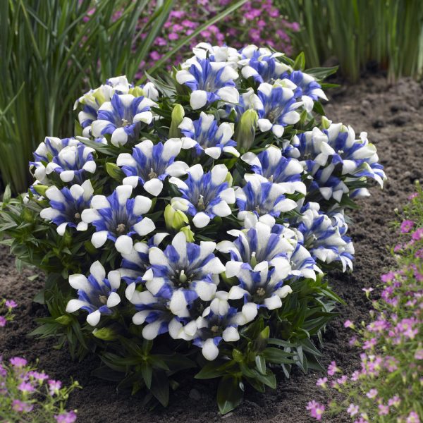 GENTIANA Scabra ‘Royal Stripes’: Une plante spectaculaire lors de ça floraison, Unique dans son genre. Cette Gentiana produit des masses de fleurs en forme de cloches avec des bandes alternées de blanc pur et de bleu gentiane. Une vivace robuste avec une floraison de masse et des fleurs rayées spectaculaires. Gentiana à croissance relativement lente au début est à son meilleur dans un sol acide bien drainé.