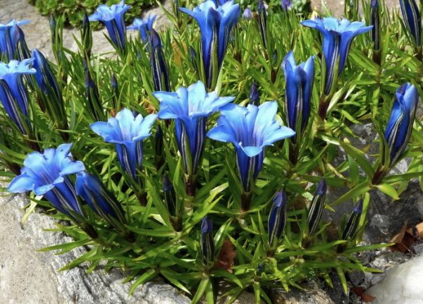 Introduction 2015. Belle vivace, étalée, prostrée, à feuilles persistantes étroites. En automne, fleurs solitaires en trompette, bleu intense. Très apprécie pour les colibris. Feuillage semblable à Phlox subulata.