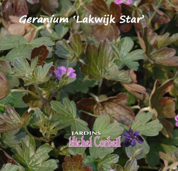Introduction 2014 – Le géranium de Sibérie (Geranium wlassovianum) est une espèce très rustique (zone 3).  À la feuillaison ce cultivar porte un feuillage bronzé, puis vert teinté de brun en été et rouge brunâtre en automne. Le plant s’élève sur 35 à 40 cm de hauteur et s’étale sur 45 à 50 cm. Les fleurs d’un pourpre violacée à la corolle nervurée de violet foncé pour le cultivar ‘Lakwijk Star’ s’épanouissent  au-dessus du feuillage entre la mi juin et la fin de septembre. Cette espèce demande une terre meuble, ordinaire à riche, bien drainée et préférablement fraîche sur un emplacement ensoleillée à légèrement ombragé.