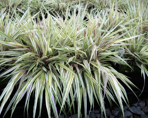 Mutation de Hakonechloa macra ‘Aureola’ nommée H. macra ‘Fubuki’, ce qui veux dire en japonais: tempête de neige. Port gracieusement arqué et plus compact que les autres variétés. Feuillage à rayures vertes et blanches. Avec la venue des températures froides de l’automne, les lignes blanches se teintent de rose. Un vrai spectacle!