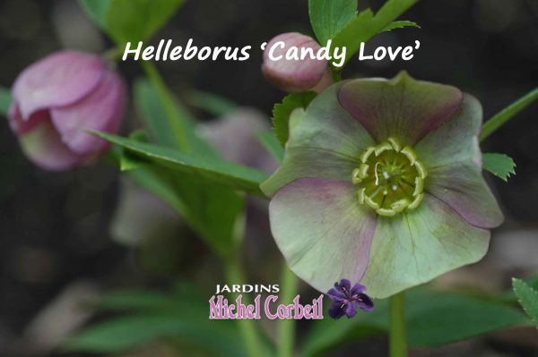 Introduction 2014. L’hellébore ‘Candy Love’ est un hybride défini comme un Helleborus x nigercors. Ce cultivar de la série «Winter Magic»; c’est une obtention de Thierry van Paemel pour la pépinière belge Het Wilgenbroak. On le surnomme ‘Vancoucer Medaillon’ en l’honneur de Jeux olympiques de l’hiver 2010 à Vancouver. Il présente un feuillage s’élevant sur 30 à 40 cm et le plant s’étale, avec le temps, sur 35 à 50 cm. Les sépales au doux coloris, de jaune très pâle à jaune verdâtre et rose pâle. Les fleurs sont simples et se dressent au-dessus du feuillage.