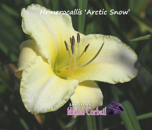 Introduction 2014. Le cultivar tétraploïde ‘Arctic Snow’ est une hémérocalle qui a obtenu deux prix de l’American Hemerocallis Society, une mention honorable en 1989 et le Award of Merit en 1992. C’est donc un hybride reconnu pour ses qualités ornementales. Le ‘Arctic Snow’ a des segments ivoire à jaune pâle avec une gorge jaune à peine verdâtre. Les fleurs ont 13,5 cm de diamètre et les hampes florales s’élèvent sur 55 à 60 cm; le plant s’étale de 45 à 55 cm. La floraison est définie comme mi saison (mi juillet) et perdure pendant trois semaines environ.