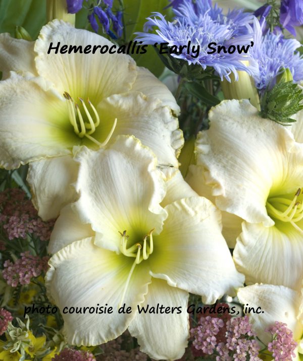 Introduction 2014. Voici un cultivar considéré par plusieurs experts comme un hybride de premier choix. Le ‘Early Snow’ offre des fleurs de 16 à 18 cm de diamètre aux sépales et pétales d’un coloris blanc teinté de jaune très pâle, à la gorge jaune verdâtres, aux bords ourlés-ondulés. Le cultivar est tétraploïde. Les hampes florales s’élèvent sur 70 à 75 cm. La floraison débute à la fin de juin ou au début de juillet; elle est remontante.