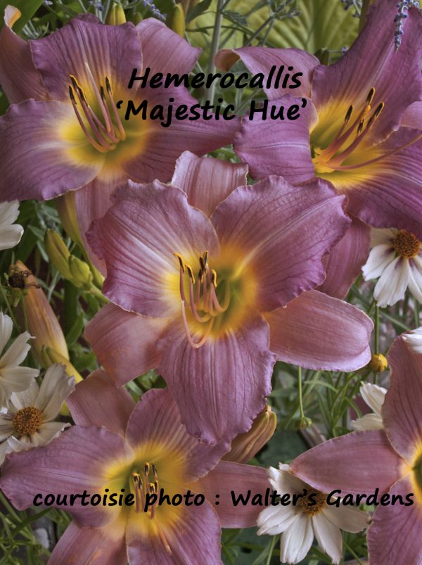 Introduction 2014. Le cultivar tétraploïde ‘Majestic hue’ est une nouveauté de la firme Walters Gardens, inc. Cet hybride est une amélioration du cultivar ‘Prairie Blue Eyes’. Les fleurs présentent des sépales et pétales d’une couleur rose foncé teintée de lavande; les pétales portent, de plus, un anneau (oeil) jaune foncé et une gorge verte. Les hampes florales s’érigent de 75 à 85 cm. La floraison est considérée comme mi saison; cela correspond, selon les régions, au début ou à la mi juillet. Celle-ci se prolonge pendant quatre à cinq semaines, quelquefois plus.