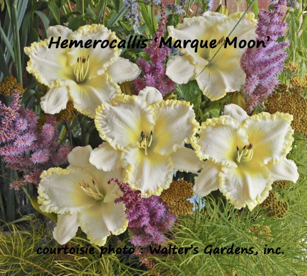 Le cultivar tétraploïde ‘Marque Moon’ est fort joli avec ses fleurs aux sépales et pétales à la bordure gaufrée et ondulée, blanc crème et jaune pâle. La fleur dégage une certaine effluve agréable. Le coloris des fleurs ressort très bien sur le feuillage vert. Le plant et ses hampes florales s’élèvent sur 50 à 60 cm; il s’étale sur 60 à 70 cm. La floraison est abondante et définie comme mi saison tardive; cela correspond sous notre latitude à la mi juillet.