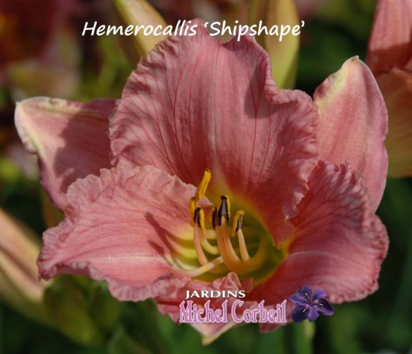 Introduction 2014. Le cultivar diploïde ‘Shipshape’ a des fleurs de 14 c de diamètre et porte des segments (sépales et pétales) roses avec une veine centrale rose pâle sur les pétales. Les fleurs sont portées sur des hampes florales de 55 à 60 cm; le plant s’étale sur 45 à 50 cm. La floraison est définies comme hâtive mi saison (début juillet). Dans les climats plus doux, cette floraison est remontante. C’est une obtention de Allen J. Wild en 1988.