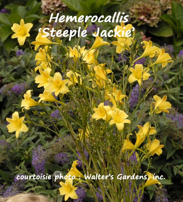 Le cultivar diploïde ‘Steeple Jackie’ possède de longues hampes florales qui s’érigent sur 1,50 à 1,80 m de hauteur. Le feuillage demeure beaucoup plus bas. Les fleurs, lorsqu’elles s’épanouissent semblent suspendues dans les airs. Celles-ci, de 6 à 7 cm de diamètre, parfumées, sont jaunes. On compte facilement 5 à 7 hampes florales par plant mâture et entre 60 et 100 boutons floraux au total. La floraison est très tardive et ne débute qu’en août et se prolonge en septembre.
