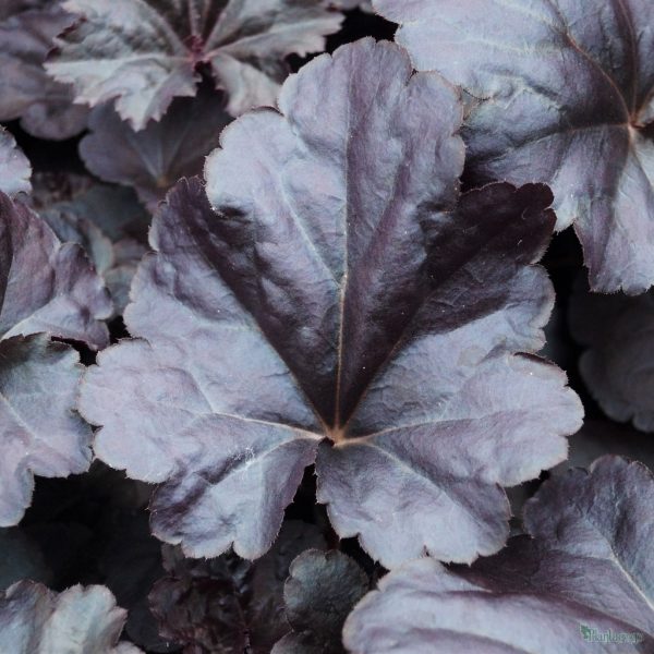 Heuchera ‘Black Sea’: Forme une touffe de feuilles lobées, dentelées, violet foncé avec des lueurs de bourgogne. Vigoureuses, ses tiges portent de nombreuses petites fleurs blanc- crème en forme de clochette. Tailler les feuilles fanées au printemps.