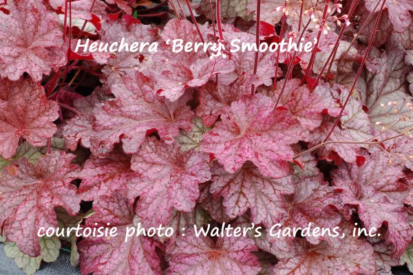 Le choix des experts JMC 2014 (catégorie « à découvrir ») et introduction 2014. Depuis les deux dernières décennies, le genre Heuchera intéresse de nombreux obtenteurs qui proposent, à chaque année, un grand nombre de cultivars. Plusieurs jardiniepuis l’arrivée de celui-ci, c’est plus d’une centaine de nouvelles heuchères à feuillage décoratif qu’il est possible de se procurer. Parmi ceux-ci, nous vous proposons le cultivar ‘Berry Smoothie’. Son feuillage émerge au printemps en présentant des feuilles rose violacé et la coloration de celles-ci évolue vers une couleur rose brunâtre. Toutes les heuchères à feuillage décoratif croissent sue un emplacement légèrement ombragé à mi ombragé, dans un sol meuble, plus ou moins riche, bien drainé mais qui conserve une certaine fraîcheur pendant toute la saison de croissance. Le feuillage s’élève sur 30 cm de hauteur, les hampes florales sur 40 à 50 cm, et le plant s’étale sur 50 à 60 cm avec le temps. Les petites fleurs blanches s’épanouissent de la mi juin à la mi juillet. La plante est rustique (zone 4).