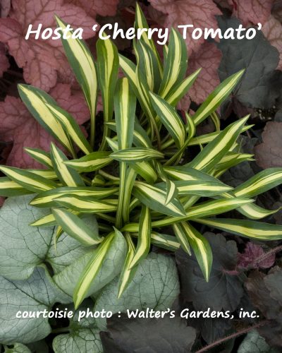Introduction 2014. La firme Walters Gardens, inc. propose une nouvelle série appelée «Dolce» qui compte présentement deux cultivars dont le ‘Dolce Cinnamon Curls’. Celui-ci est un plant de 20 à 30 cm de hauteur et de 45 à 50 cm de diamètre. Le feuillage présente des feuilles entières, lobées, aux limbes rouge cuivre, ondulés et aux revers d’un rouge violacé. Ce cultivar est intéressant surtout pour son feuillage décoratif. De petites fleurs, sans grand intérêt, s’épanouissent au dessus du feuillage.