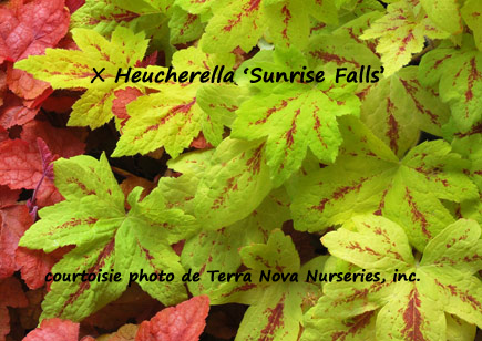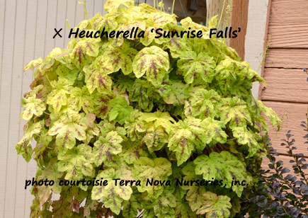La série «Falls», commercialisée par la firme Terra Nova Nurseries, inc., propose des heucherelles convenant autant à la culture en pleine terre qu’en paniers suspendus ou en contenants. Le cultivar ‘Sunrise Falls’ porte des feuilles entières, profondément lobées, aux limbes d’un coloris vert jaunâtre (chartreuse) marqués irrégulièrement le long des nervures de rouge. à l’automne, les feuilles prennent une coloration plus rougeâtre. Le feuillage s’élève sur 15 à 20 cm et s’étale sur 70 à 80 cm. De fleurs blanches groupées en racèmes lâches se développent au printemps au-dessus du feuillage. La plante tolère une situation ensoleillée en autant que le sol demeure frais à humide en tout temps.