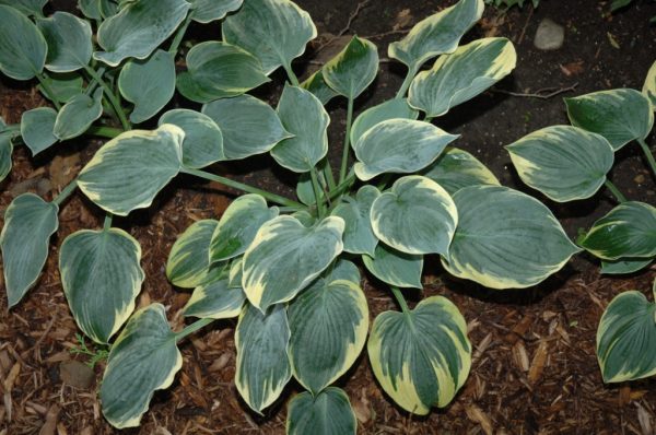 Beau feuillage bleu poudre marginé généreusement d’une bordure jaune crème qui deviendra blanchâtre au cours de la saison. Fleurs lavandes sur des tiges de 50cm/ 20 ». Croissance rapide. Résistant aux limaces.