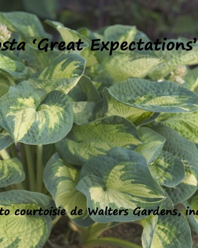 Spécimen de grande envergure. Feuillage bleuté, bosselé, épais et très résistant aux limaces. Fleurs blanches (100cm/ 40 »).