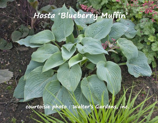 Le cultivar ‘Blueberry Muffin’ est un plant d’environ 35 cm de hauteur et de 60 à 70 cm de diamètre. Les feuilles cordées-allongées, gaufrées, présentent des limbes au coloris vert bleuté (glauque) et des pétioles de couleur marine. Des fleurs tubulaires lavande se développent sur des hampes florales de 50 à 60 cm de hauteur en juillet.