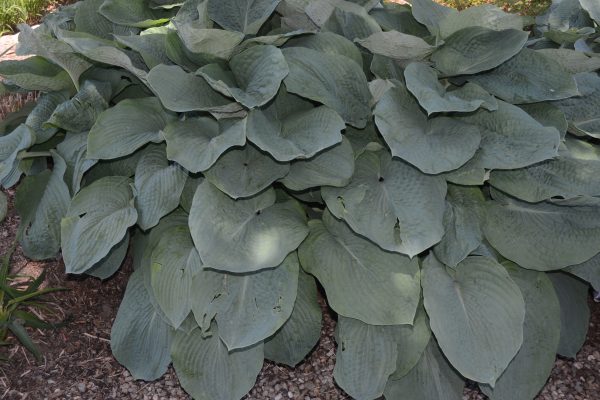 Hosta issu d’un croissement entre H. sieboldiana et H. ‘Tokudama’. Feuillage bleu bosselé. Feuilles cordées. Fleurs blanches (70cm/ 28 »)