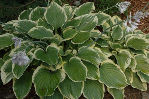 Hosta de catégorie moyenne à large qui ressemble beaucoup au célèbere H. ‘Liberty’ mais avec une marge jaune crème plus étroite. Hosta ‘Clifford Forest Fire’ tout comme H.’Liberty’ est un cultivar issu de Hosta ‘Sagae’, ce qui explique leur grande ressemblance. Feuillage large,cordé, vert glauque, marginé de jaune vert qui tourne au blanc crème en saison. Fleurs lavande pâle au-dessus du feuillage.