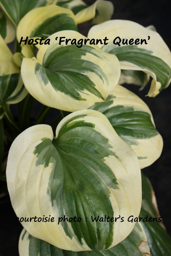 Le Hosta  ‘Fragrand Queen’ est une amélioration du cultivar ‘Fragrant Bouquet’; le limbe des feuilles cordées-arrondies, d’une couleur vert foncé au centre largement et irrégulièrement bordé ou marginé de blanc crème. Un plant vigoureux, au feuillage de 35 à 40 cm de hauteur et de 60 à 80 d’étalement. Les fleurs tubulaires blanches ou lavande très pâle, parfumées, s’épanouissent au sommet des hampes florales de 50 à 70 cm de hauteur.
