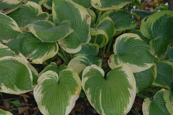Feuillage bosselé, cireux, bleu-vert, marge irrégulière jaunâtre. Feuille ovée, cordée. Grand hosta très populaire. Fleur blanche. Résistante aux limaces.