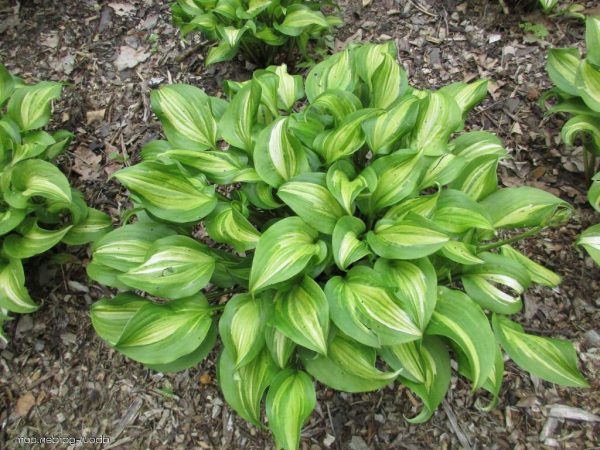Hosta au feuillage vert chartreux marginé de vert foncé. Feuilles étroites, luisantes et courbées. Fleurs lavandes sur tiges florales de 65cm/ 26 ». Résistant aux limaces.